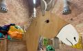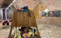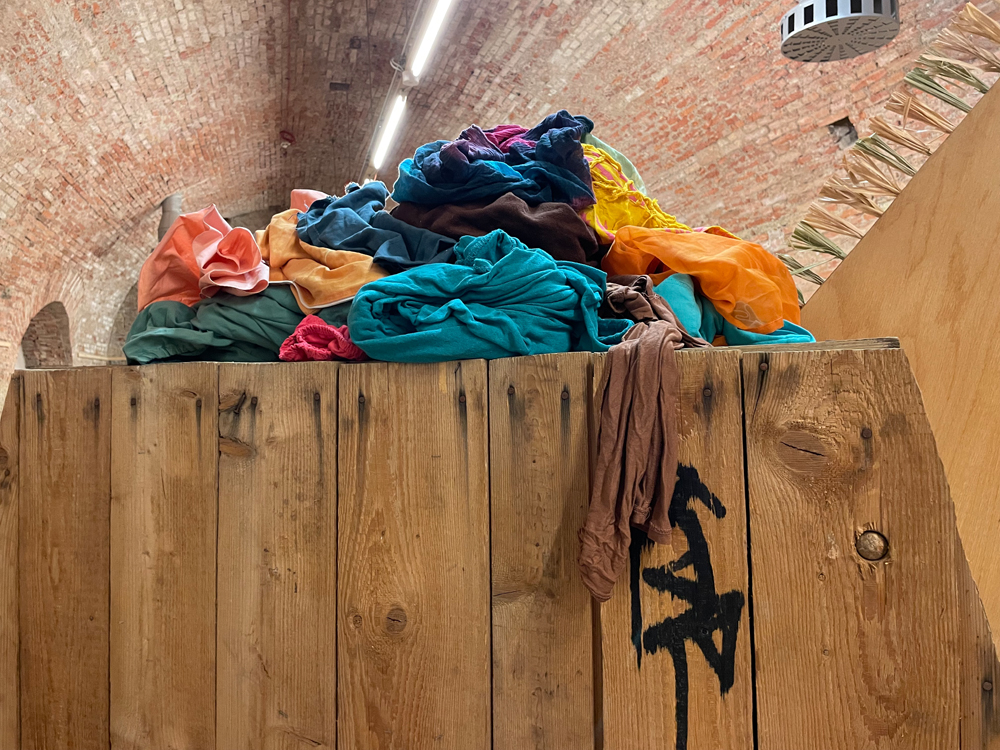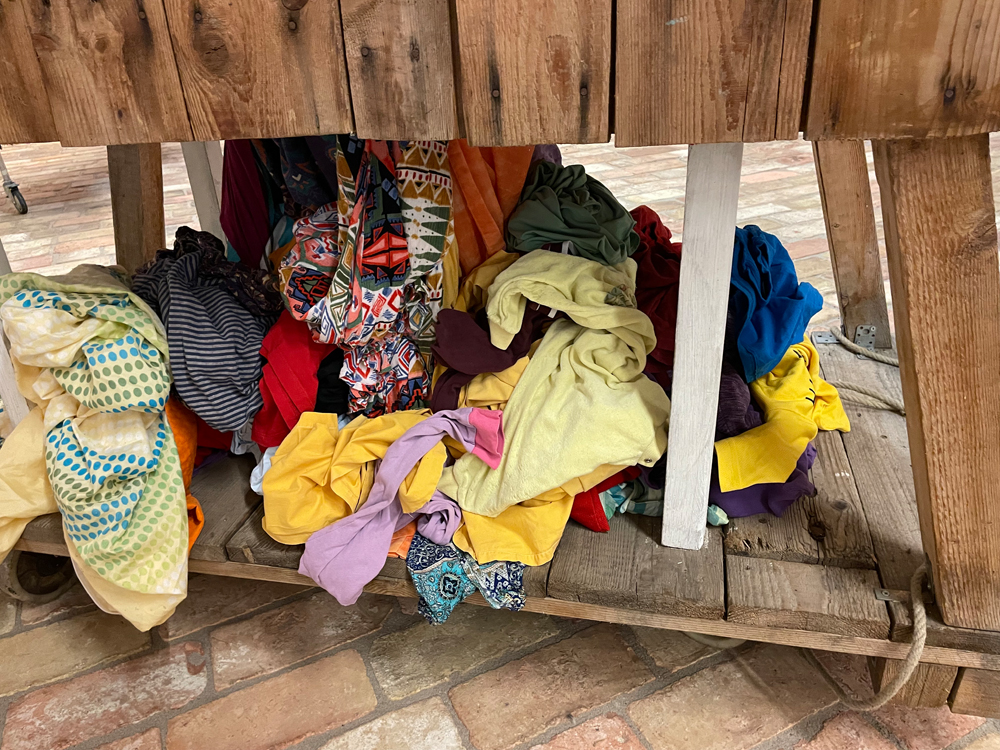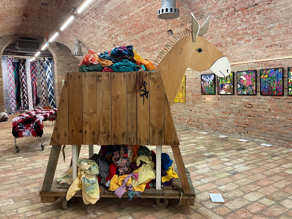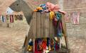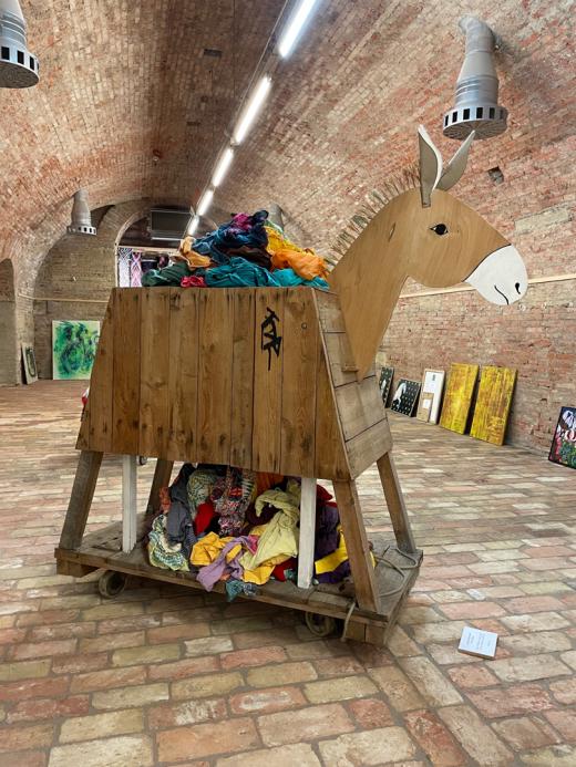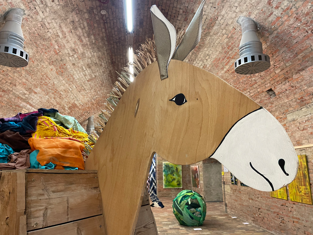 A hollow donkey, constructed from found objects, carries the discarded clothes of our society. Even its hollow belly can no longer contain the sheer volume of clothing, which spills out of its body in a colorful and decorative display. What campaign remains for it to salvage the situation?