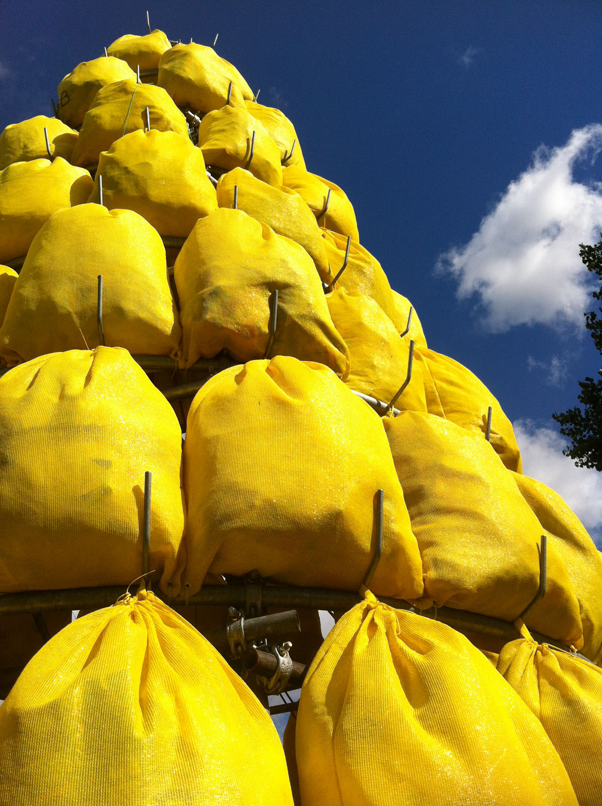 Der gelbe Sackbaum besteht aus einem 8 Meter hohen Metallgerüst, das in Anlehnung an den »Flaschentrockner« von Marcel Duchamp erbaut wurde.