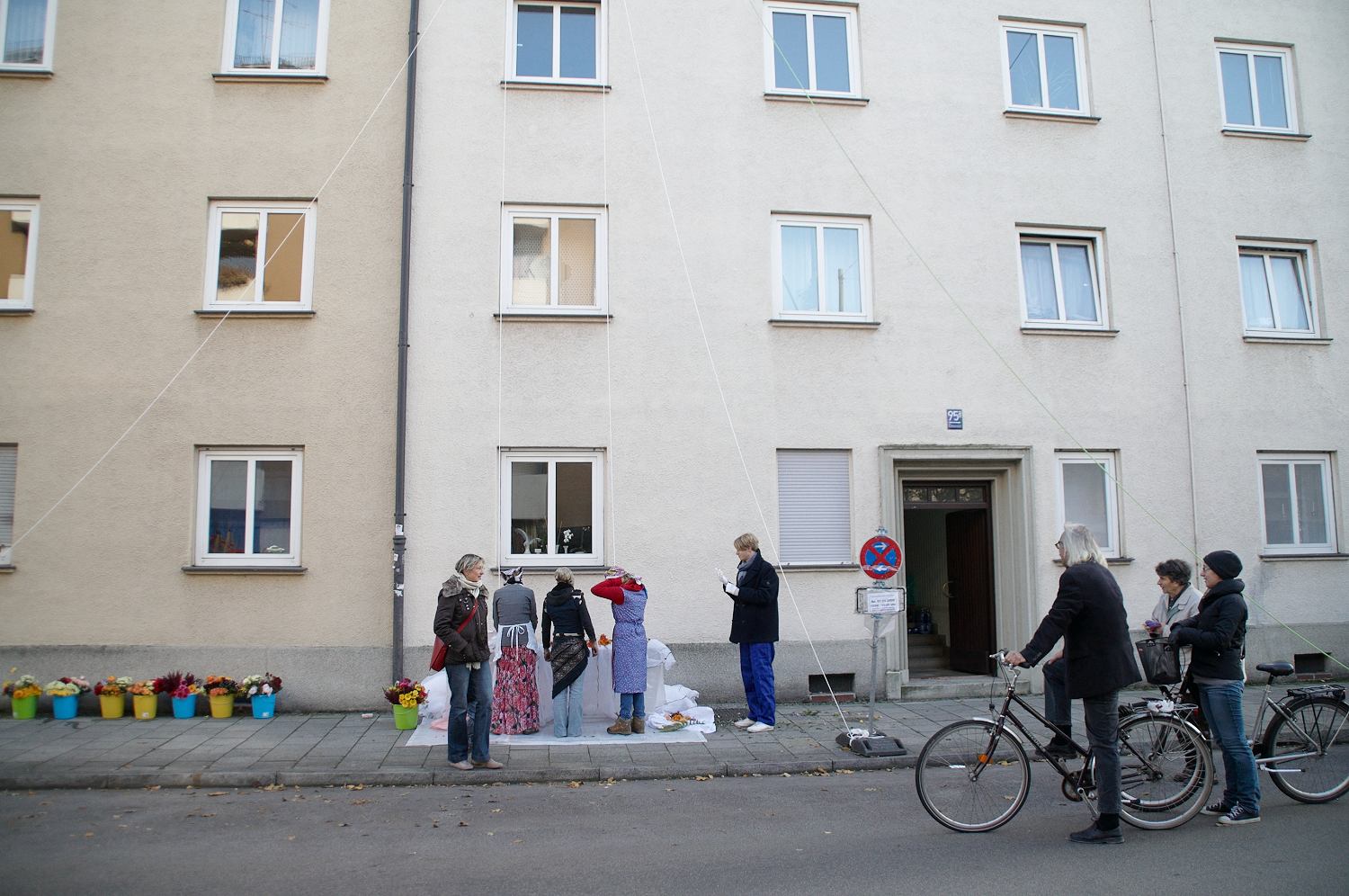 Auf einem Tisch auf dem Gehsteig vor einer unattraktiven Häuserfassade in der Clemensstraße ist ein netzartiger Stoff ausgebreitet. Drei Frauen stecken Blüten in den Stoff. Die Blumen wurden u.a. von PassantInnen und HausbewohnerInnen gebracht. Gleichmäßig wird der bestückte Stoff an der Fassade nach oben gezogen, so dass nach und nach der Blütenteppich sichtbar wird. Die Fassade erhält ein mit Blüten übersätes Kleid. Wenn die Stoffbahn das Ende der Zugseile erreicht hat, beenden die Frauen ihre meditative Steckarbeit.