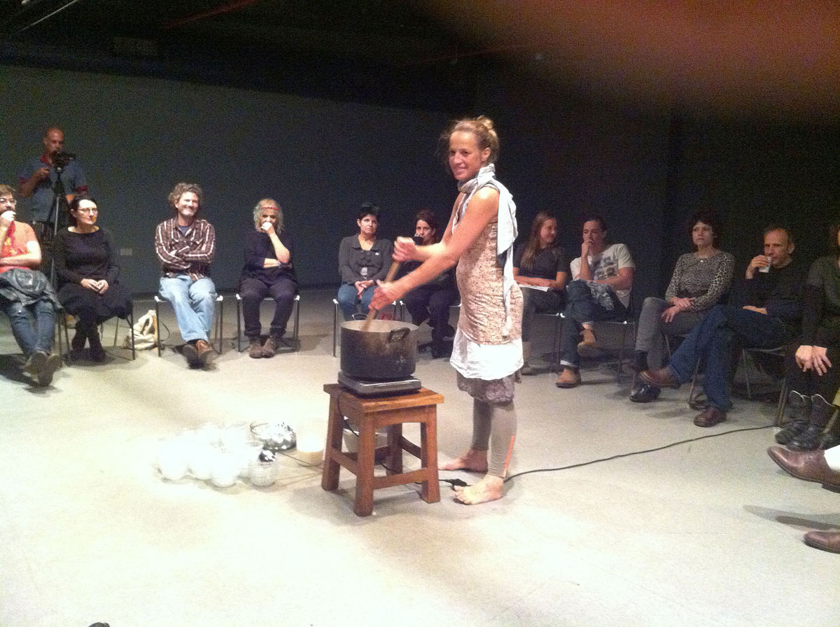Die Künstlerin kocht einen Haferschleimbrei. Das Publikum sitzt im Kreis um die Kochstelle. Dazu spricht sie den Text des Spieles (siehe rechts) Safta bischla Deisa (Goßmutter kocht einen Haferbrei) auf Hebräisch. Bei: hi natna le se (dem hat sie gegeben) gibt sie jeweils einem Gast eine Schale mit Brei. Die Assistentin kommt mit Zimt und Zucker und Besteck. Das fünfte Schälchen bleibt leer und bekommt ein Teelicht und wird auf dem Boden um die Kochstelle abgestellt. Jeder, der keinen Brei will wird gekitzelt. Während die Leute essen, mehren sich die Schälchen mit den Teelichtern und die leer gegessenen Schälchen bekommen ebenfalls ein Teelicht. Es wird dunkel und die Künstlerin schart die Schalen um sich und nimmt eine schützende Haltung ein. Die Menge der Schalen mit Kerzen wird so groß, dass die Künstlerin sie nicht mehr in ihrem schützenden Schoß halten kann. Eine weitere Performancekünstlerin(Marta Bosowska) durchbricht die Atmosphäre mit lauten metallenen Geräuschen und versucht das Meer der Lichter mit einer großen Geschoßhülse auseinander zu treiben. Bei dem Versuch, die Lichter zu schützen, verbrennt sich die Künstlerin an den Flammen und die Lichter verlöschen dabei nach und nach.