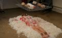A square grid is hanging down the ceiling like a swing. I place six stones and six balloons filled with red paint on it. Under the grid I make a “bed” out of white feathers.