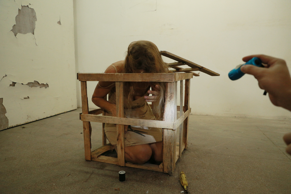 Diogenes chose to live in poverty and be happy with what surrounded him. He was fooling the people by carriyng a lamp during the daylight, claiming to be looking for an honest man. From the street I bring a very frail wooden frame to the gallery, which is used on site to protect goods during transport and put myself in it. The frame has a cube shape and a lid.