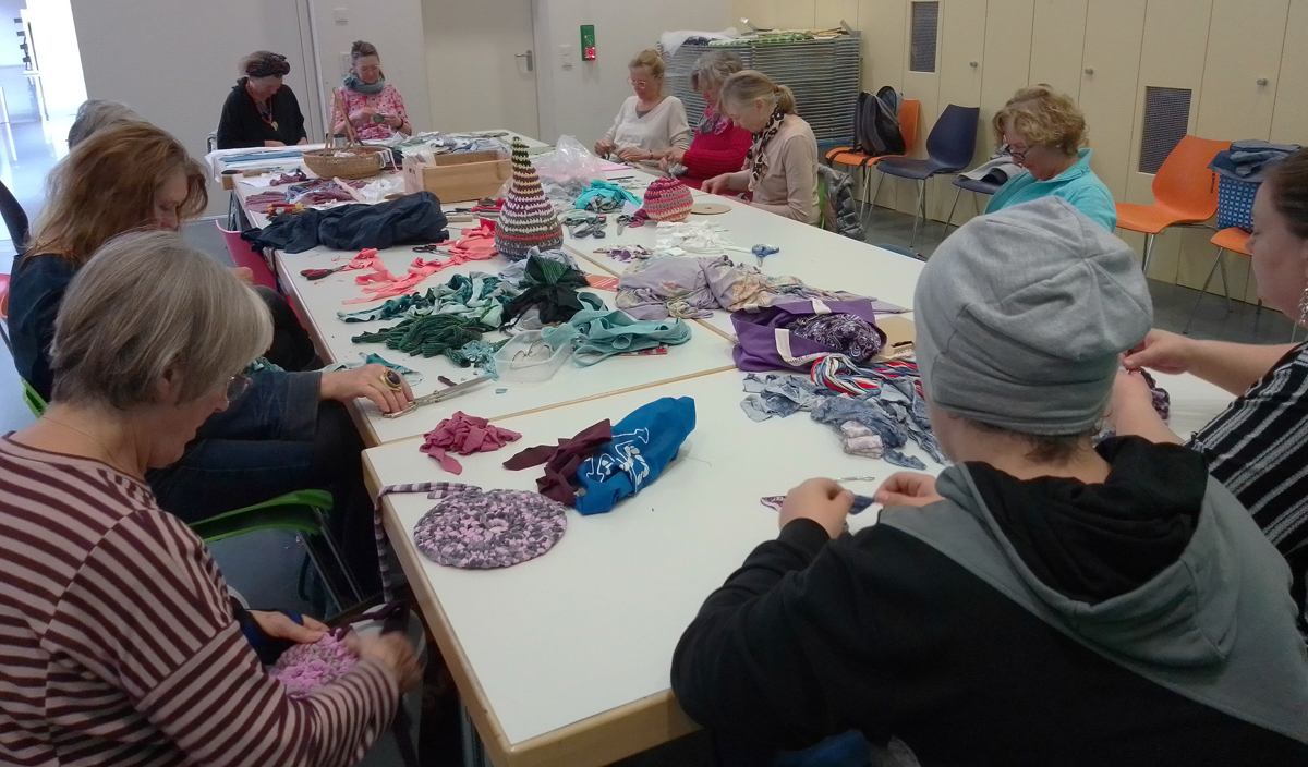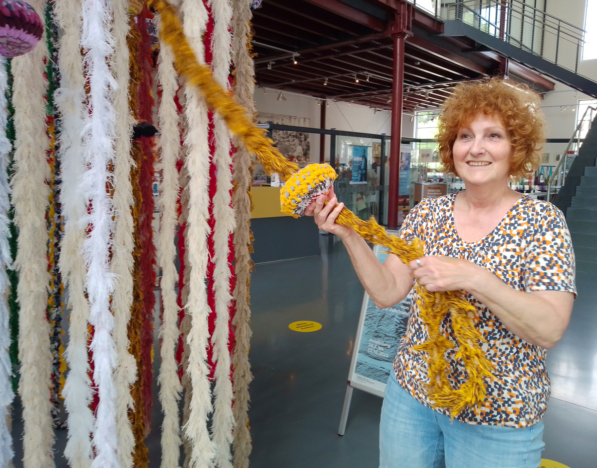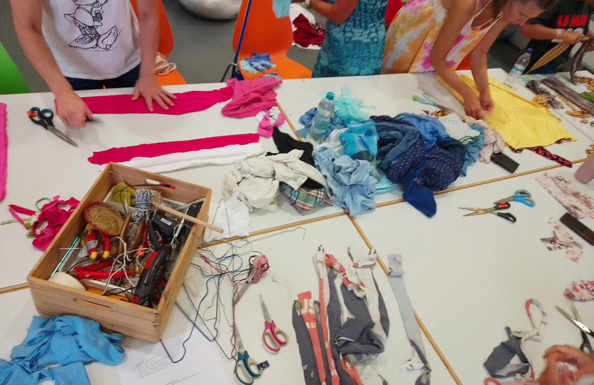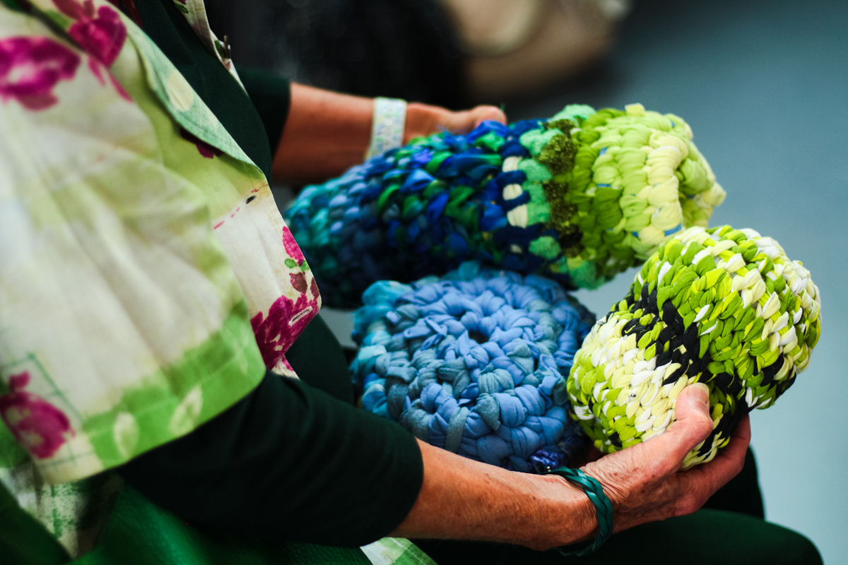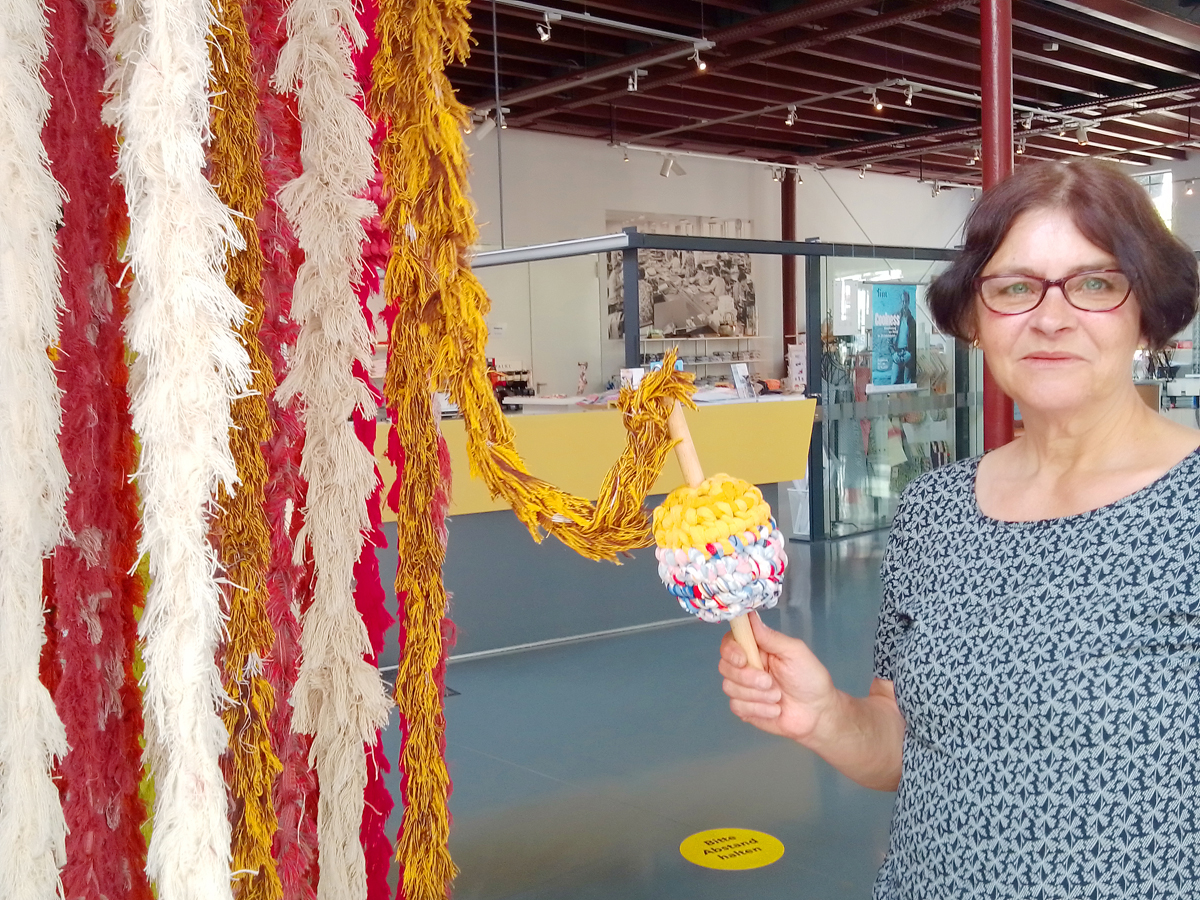 In advance of an interactive production of art objects made from recycled materials, a call for the collection of used clothes was launched in the museum. Visitors and citizens were able to put their old clothes in baskets sorted by color in the museum foyer. Interactions between the artist and visitors took place on three weekends over the course of the first half of 2023. The visitors learned the technique of Amish rug weaving, which they then used to create three-dimensional objects from the old clothes.