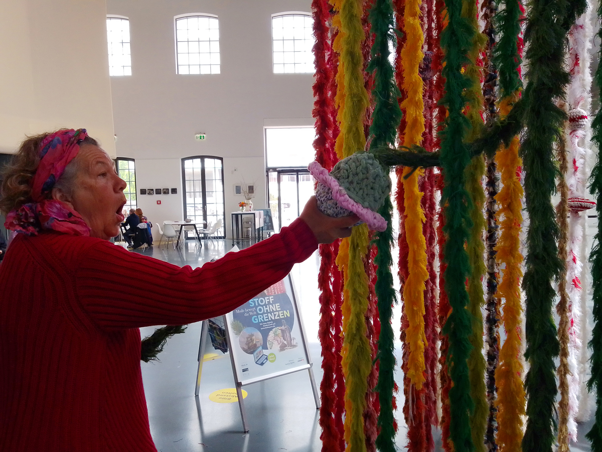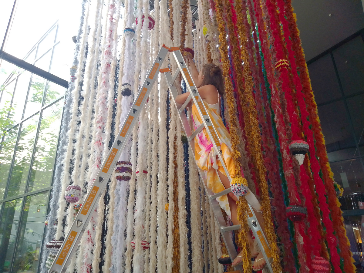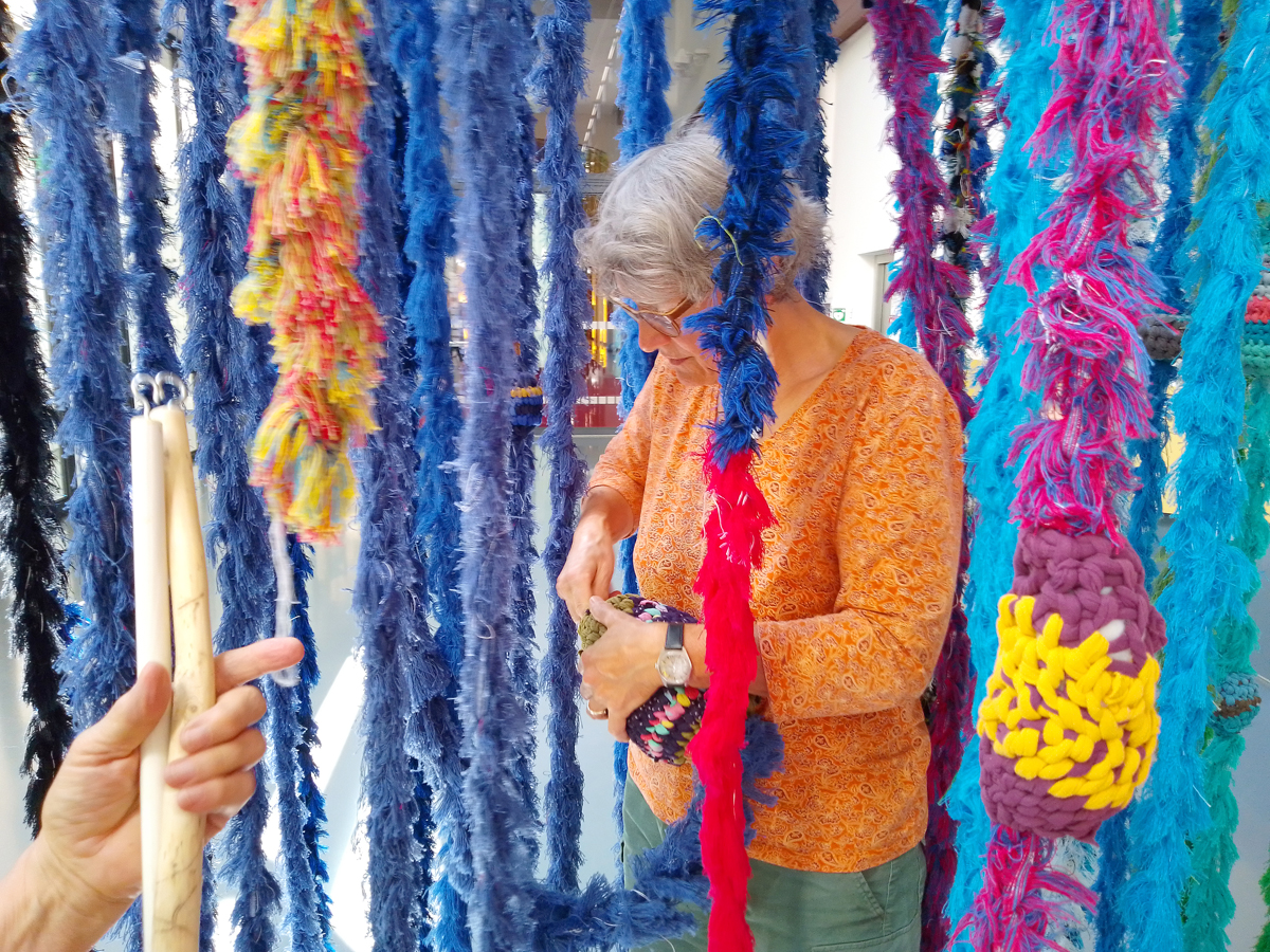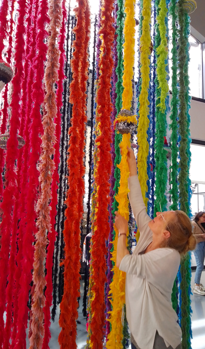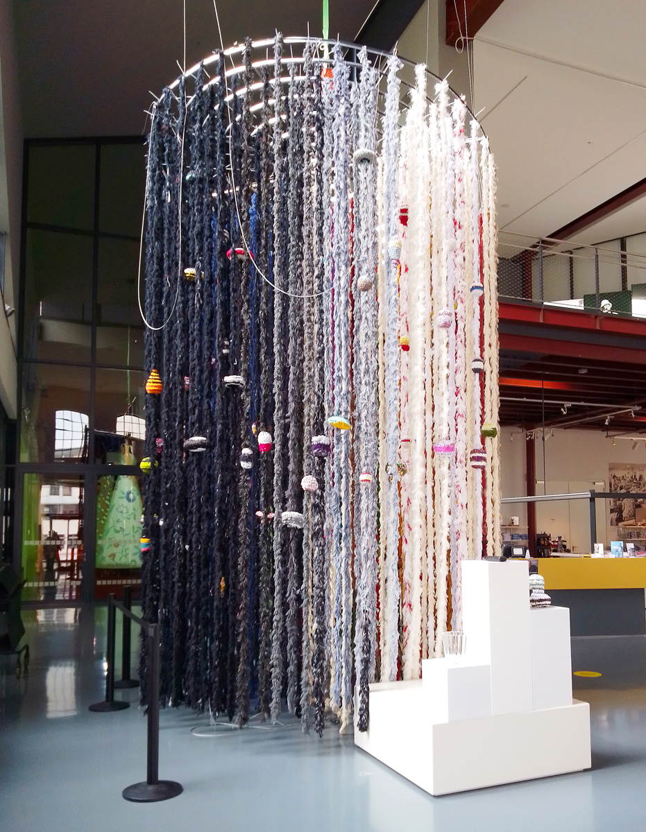 They then threaded these onto the lianas installed in the foyer according to their own aesthetic understanding. The artist made the lianas from the selvedges that fell off during production in the museum. The installation grew from month to month and changed its appearance through the active participation of the visitors.