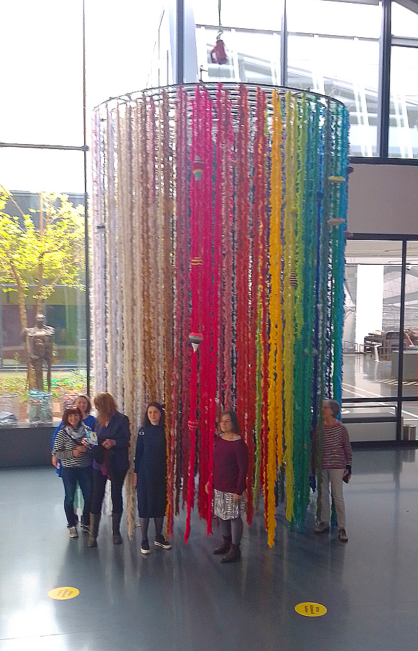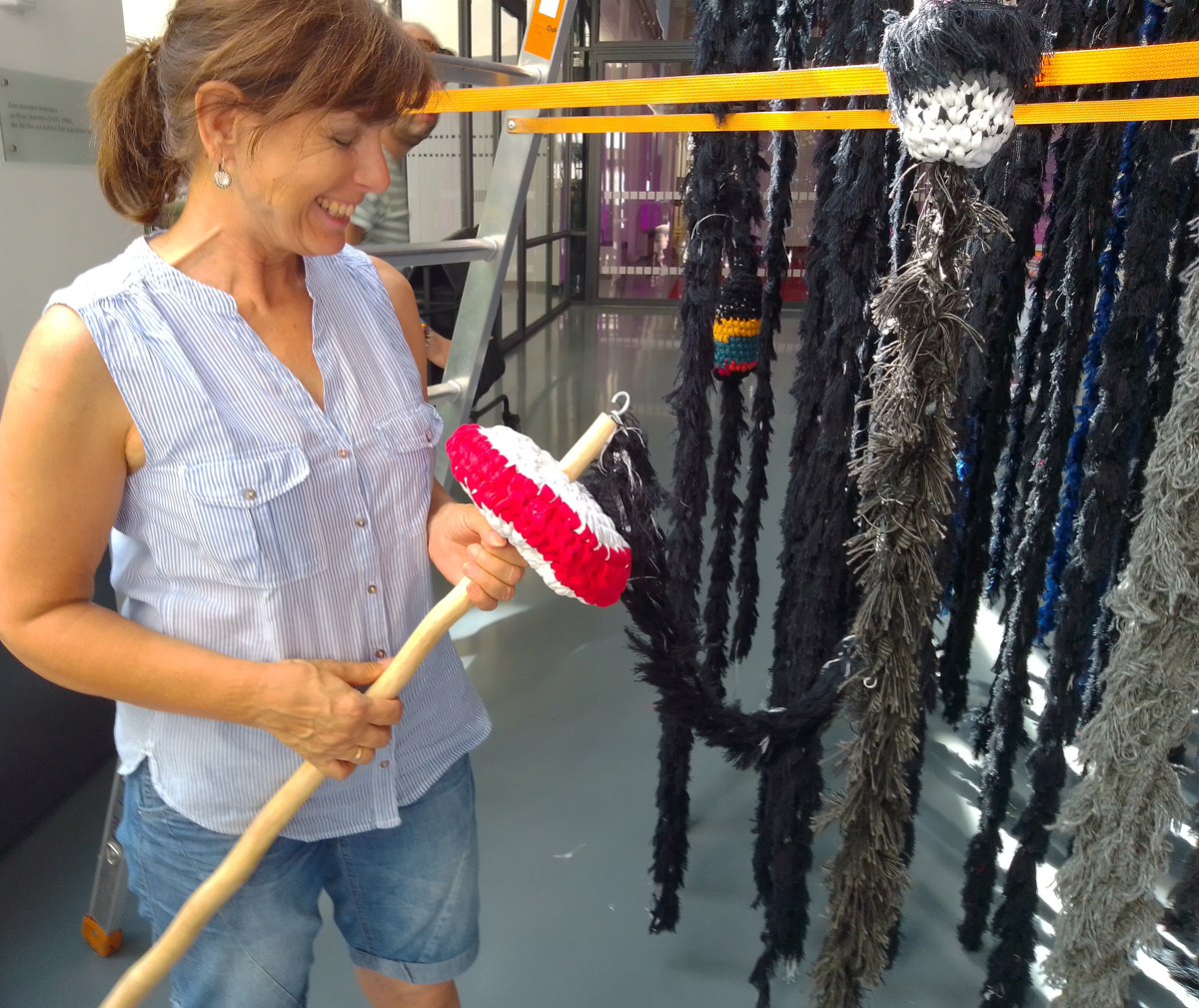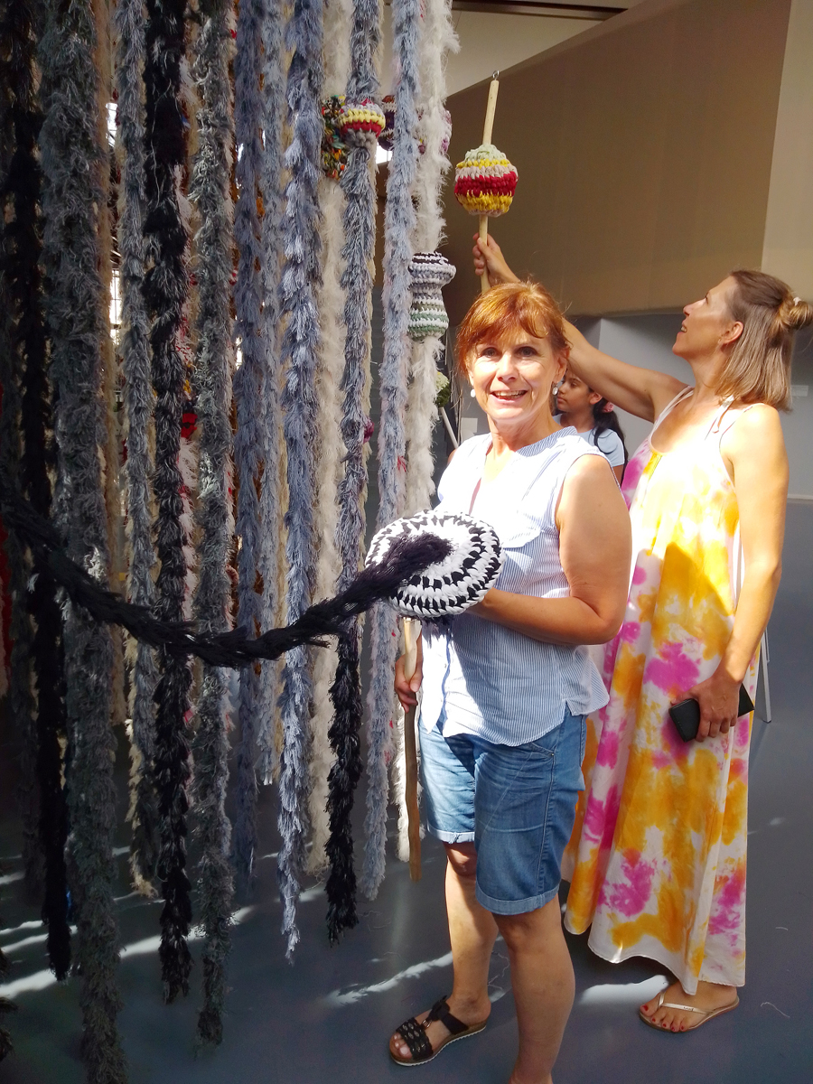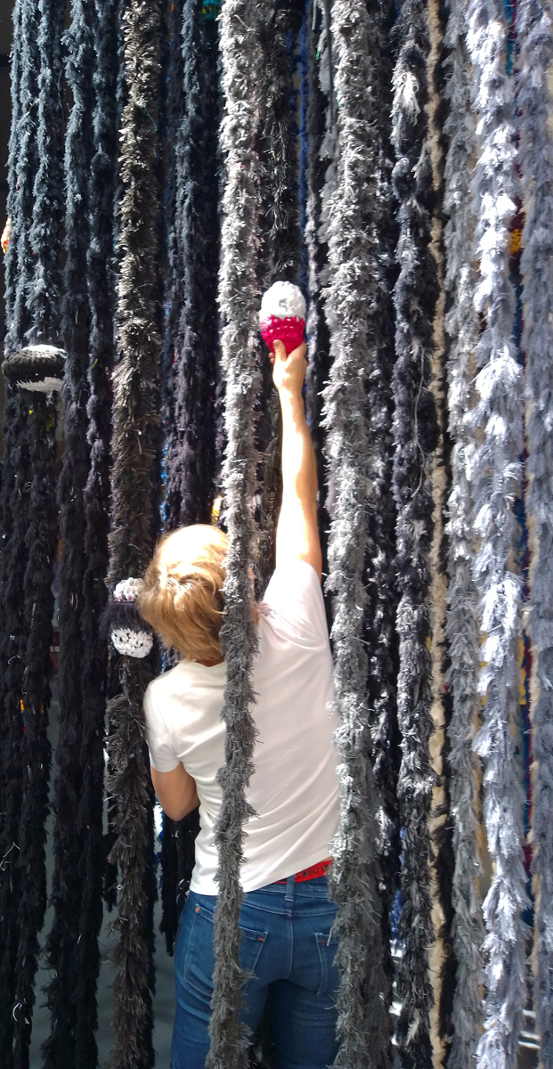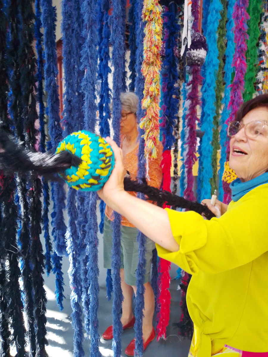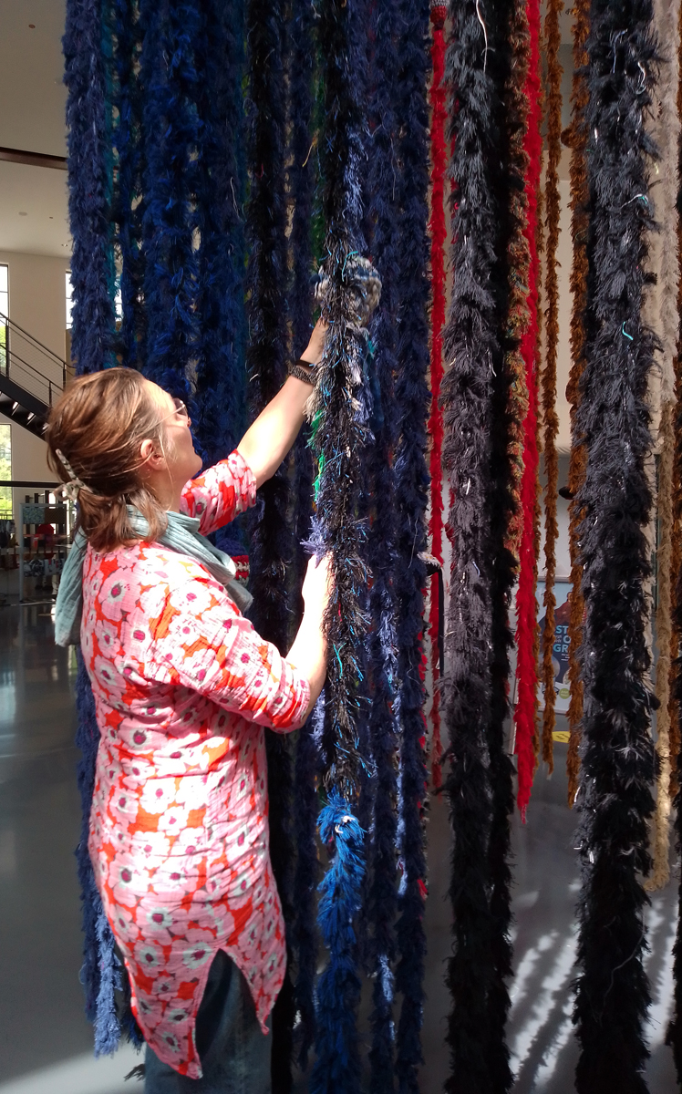 They then threaded these onto the lianas installed in the foyer according to their own aesthetic understanding. The artist made the lianas from the selvedges that fell off during production in the museum. The installation grew from month to month and changed its appearance through the active participation of the visitors.