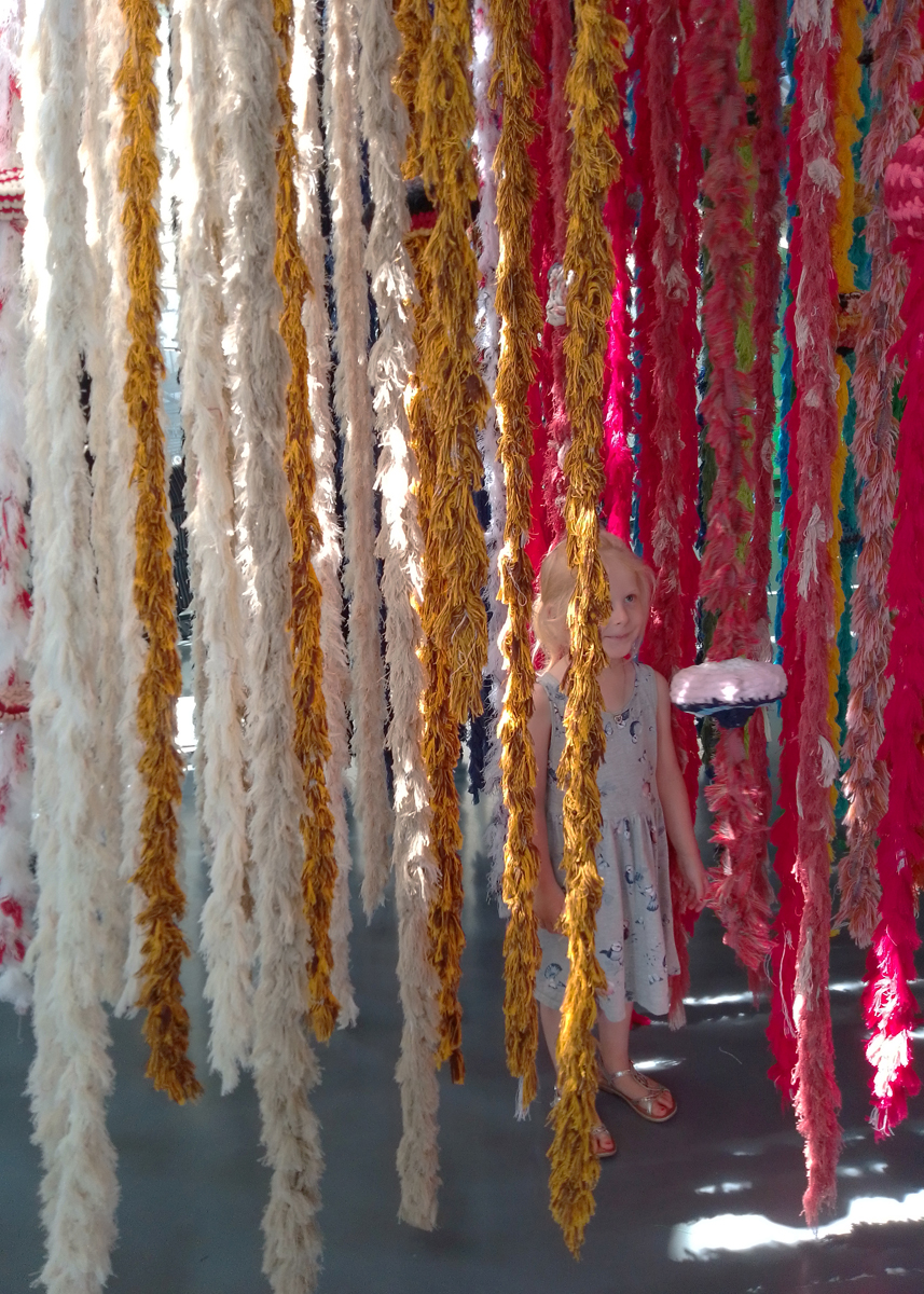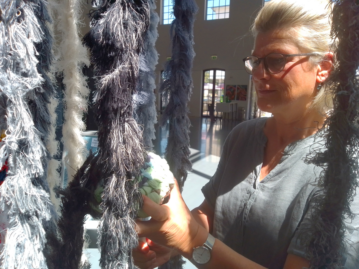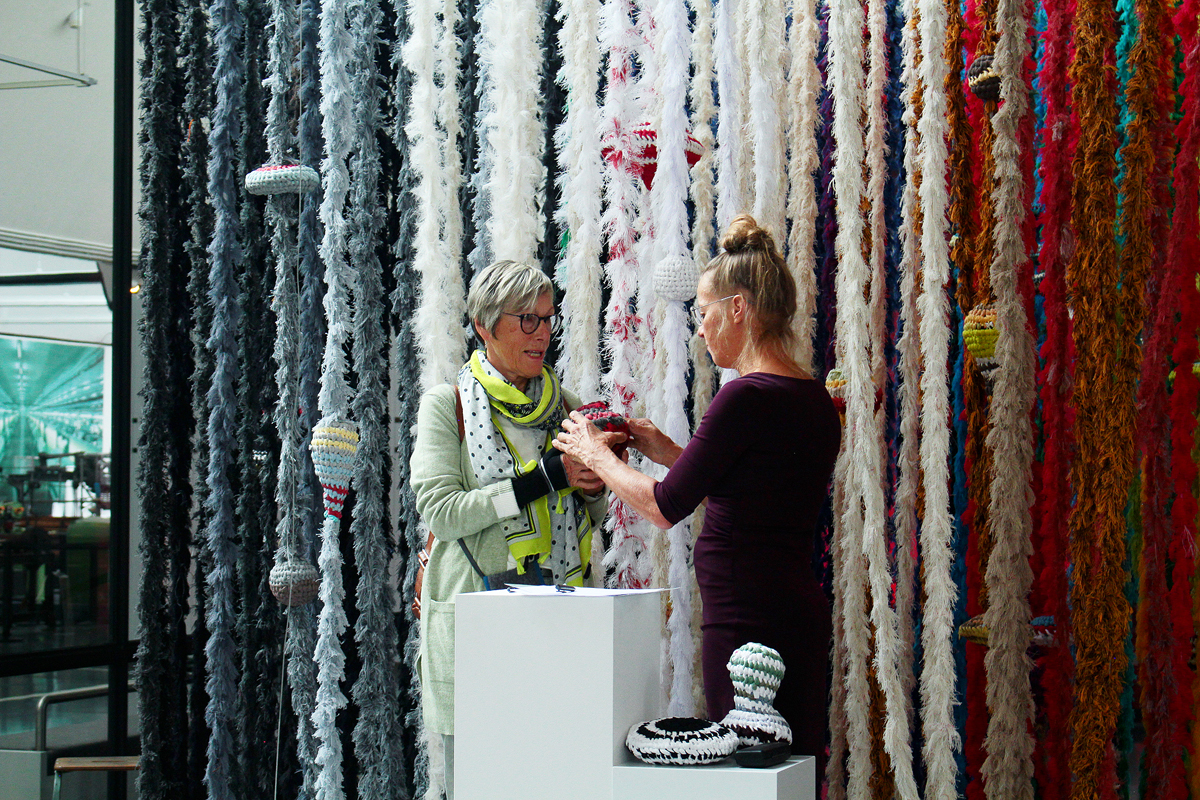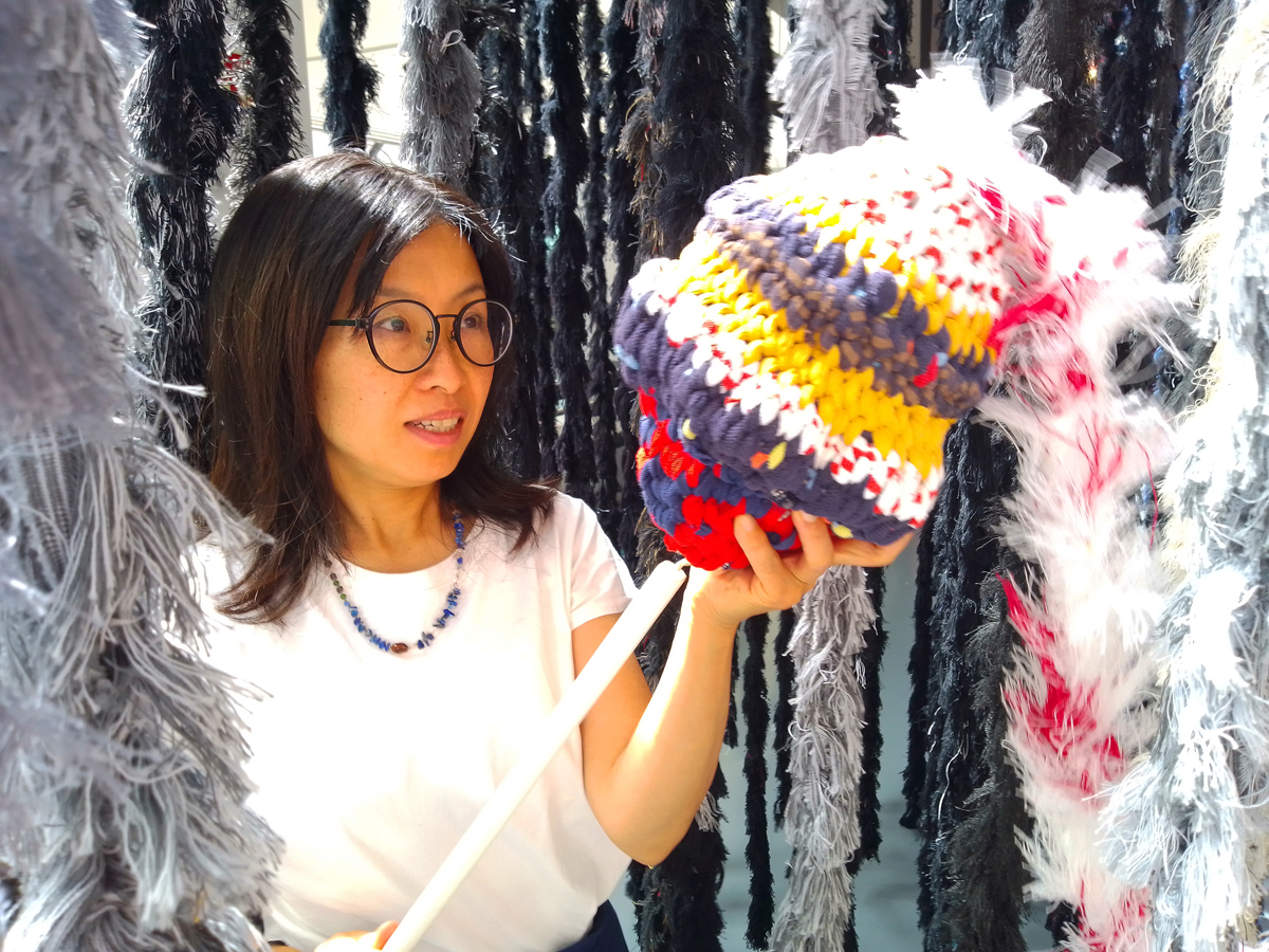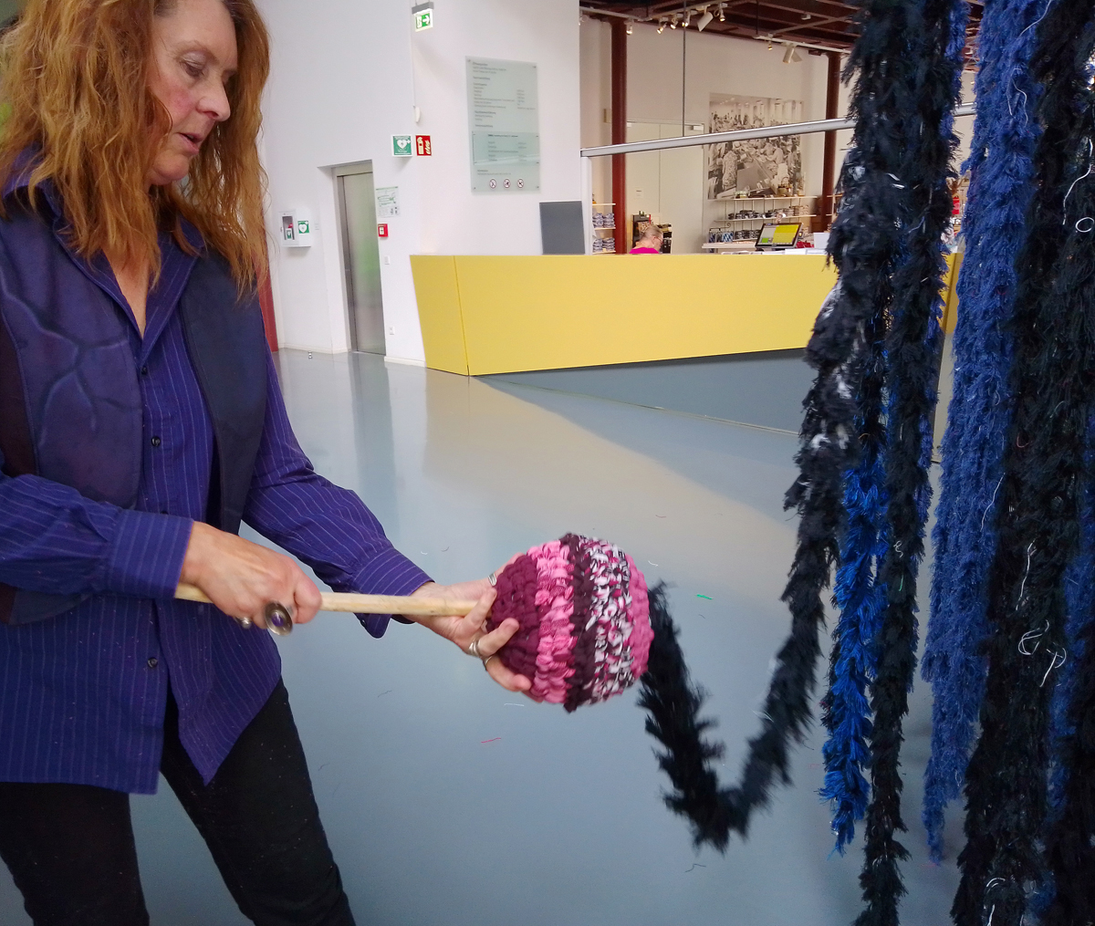 They then threaded these onto the lianas installed in the foyer according to their own aesthetic understanding. The artist made the lianas from the selvedges that fell off during production in the museum. The installation grew from month to month and changed its appearance through the active participation of the visitors.