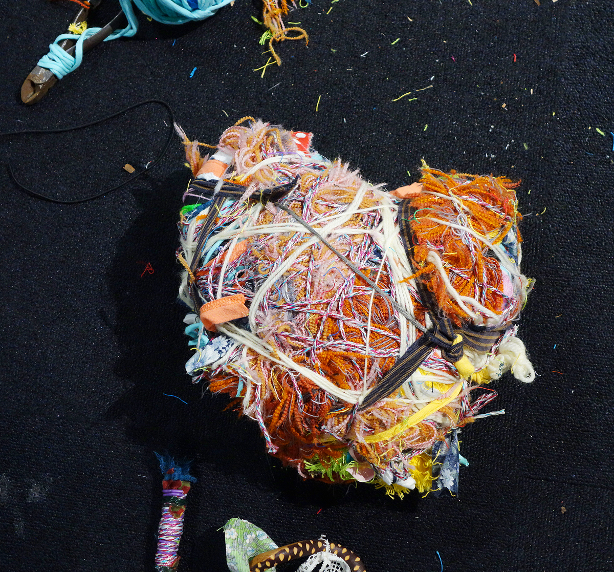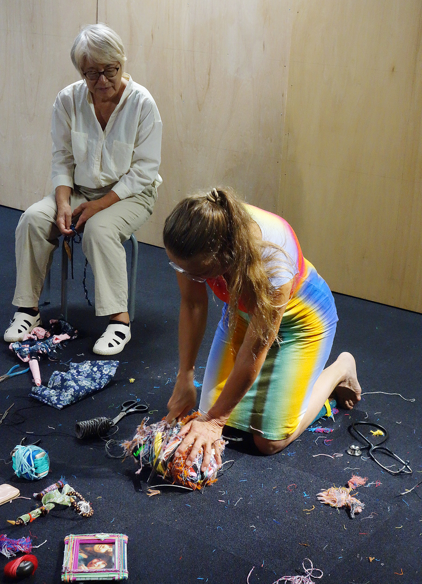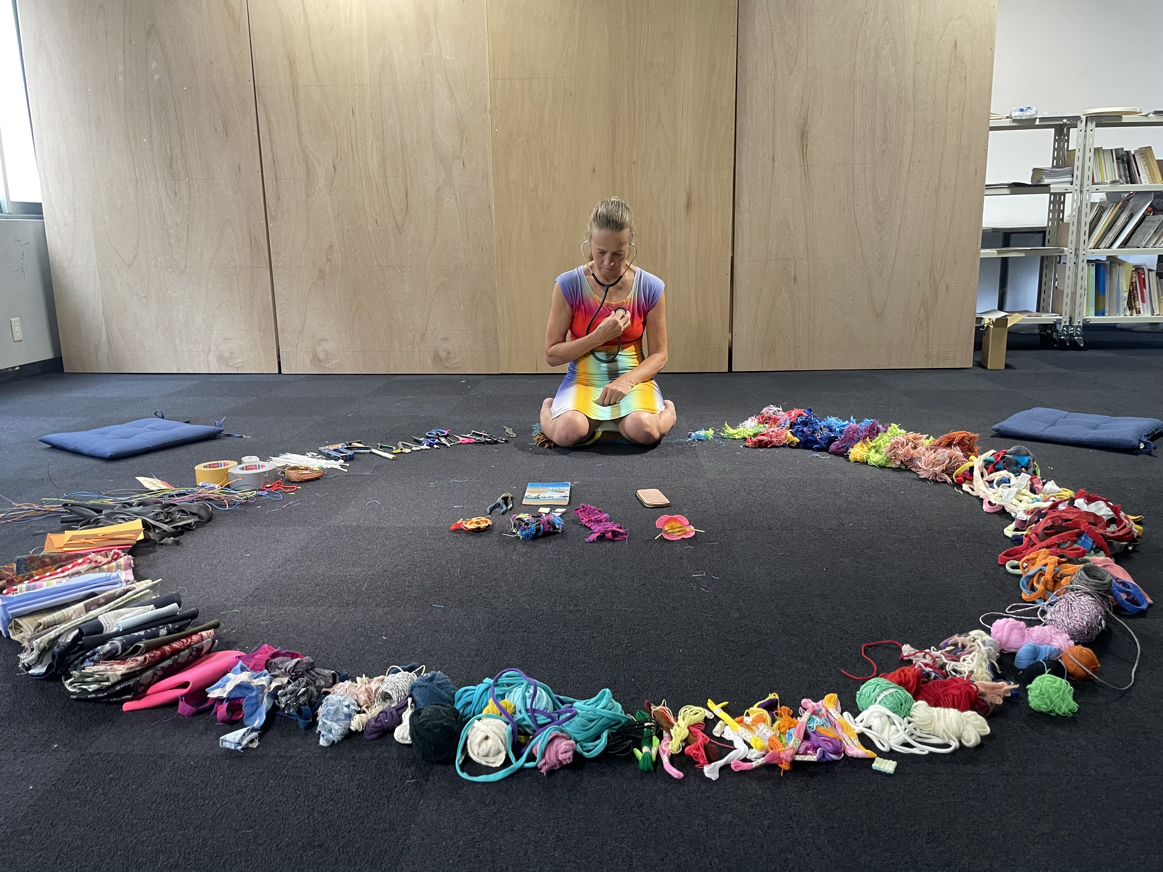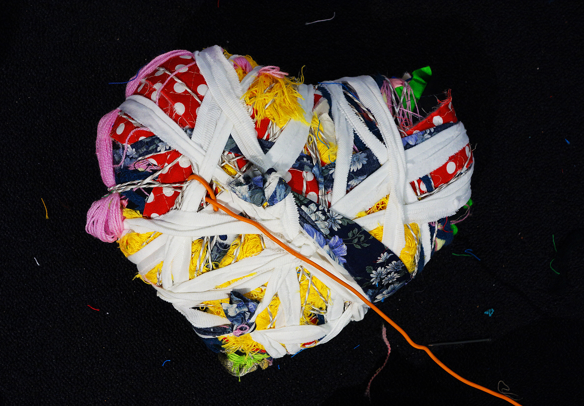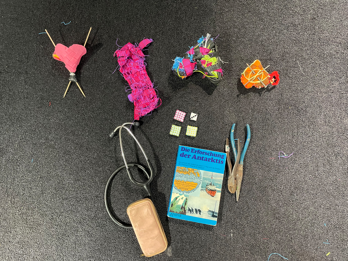 I brought along various materials collected from other artistic endeavours. Many people on site also donated small scraps of fabric, threads and other textile materials. I form a circle out of all the materials. Then I listen to my heart beating with Paul Cuillard's stethoscope and let the visitors do the same. I wrap various materials around a book that was very dear to me as a child, namely about expeditions to the North and South Pole, to form a heart shape.