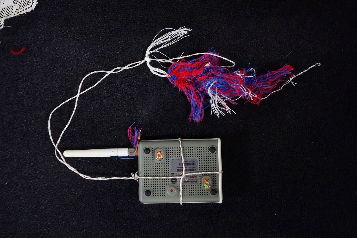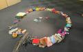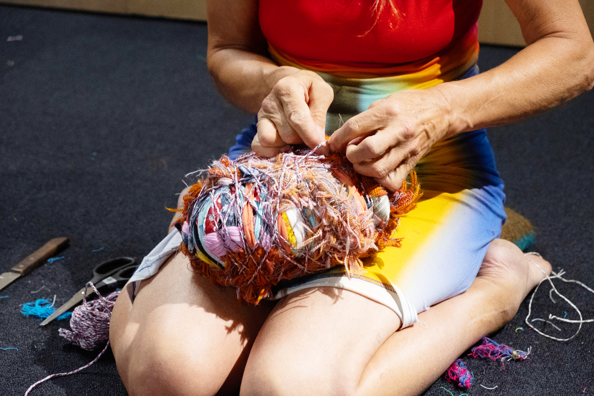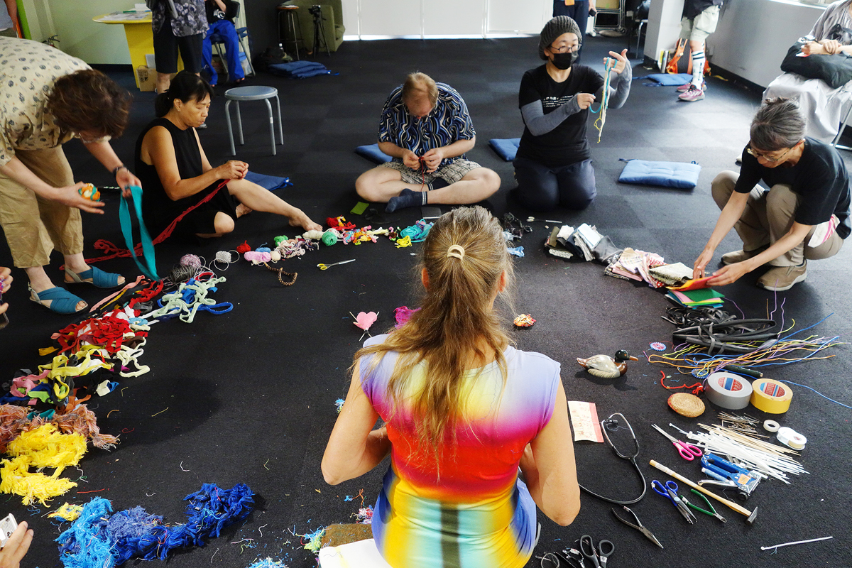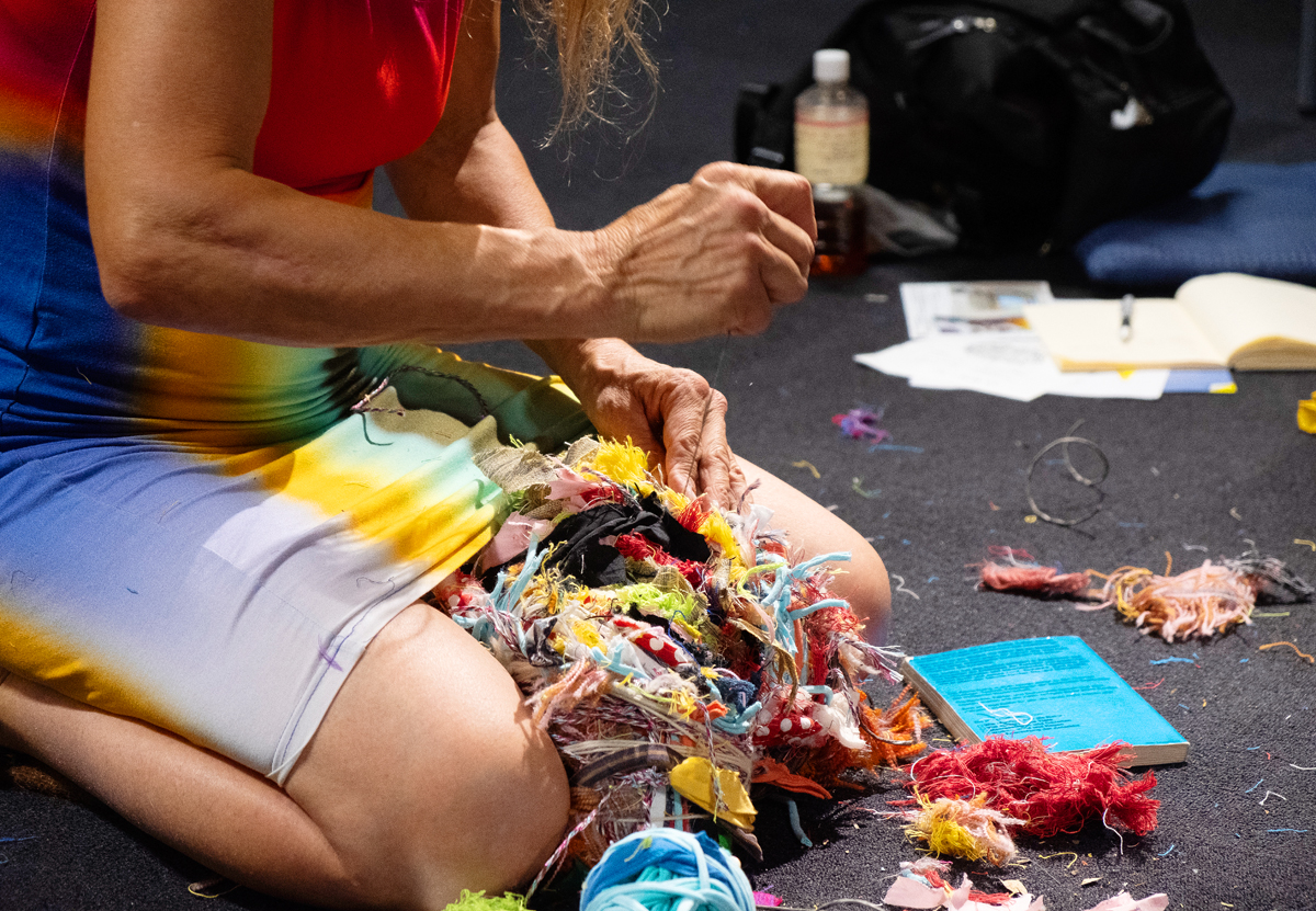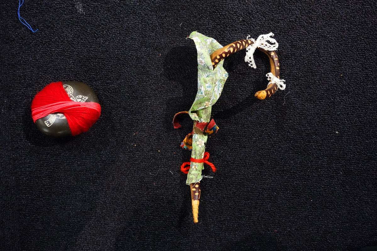 I brought along various materials collected from other artistic endeavours. Many people on site also donated small scraps of fabric, threads and other textile materials. I form a circle out of all the materials. Then I listen to my heart beating with Paul Cuillard's stethoscope and let the visitors do the same. I wrap various materials around a book that was very dear to me as a child, namely about expeditions to the North and South Pole, to form a heart shape.